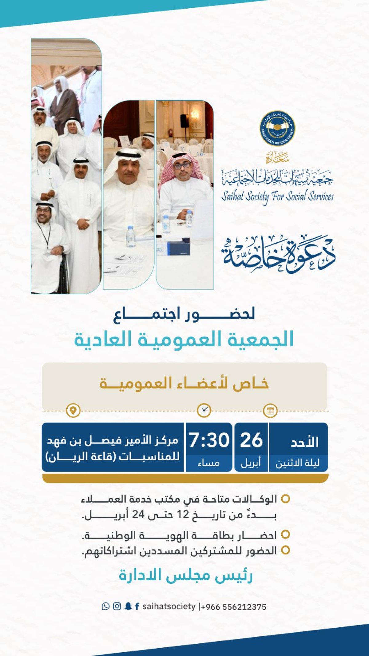 تعتزم جمعية سيهات للخدمات الاجتماعية «سعادة» عقد اجتماع الجمعية العمومية لعام 2026 وذلك في السادس والعشرين من ابريل الجاري وذلك للتصويت على عدد من البنود والقرارات التي تهدف إلى تعزيز الحوكمة، ودعم الاستدامة المالية، وتطوير الأداء المؤسسي للجمعية.